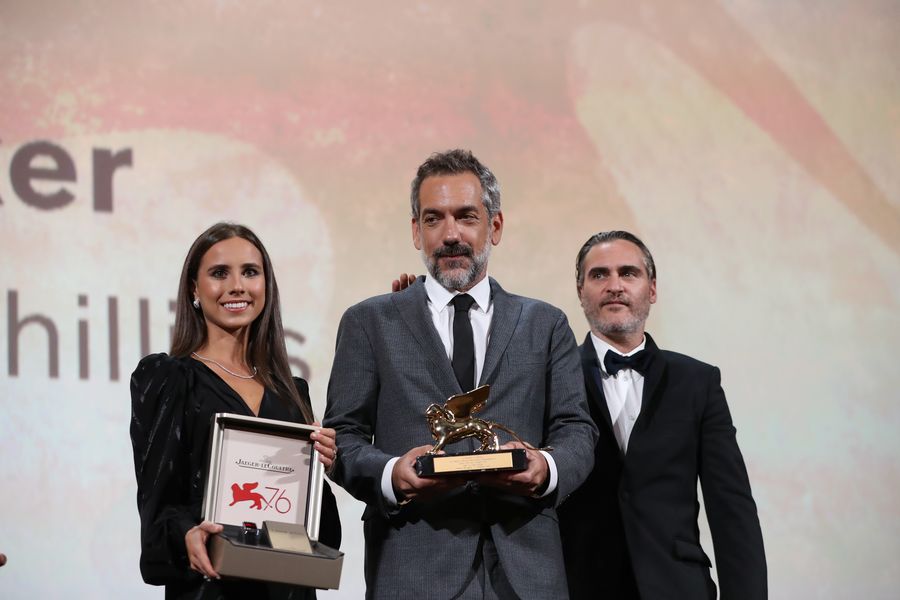 American director Todd Phillips (C) reacts after his film "Joker" winning the Golden Lion for best film at the 76th Venice Film Festival in Venice, Italy, on Sept. 7, 2019. (Xinhua/Cheng Tingting)