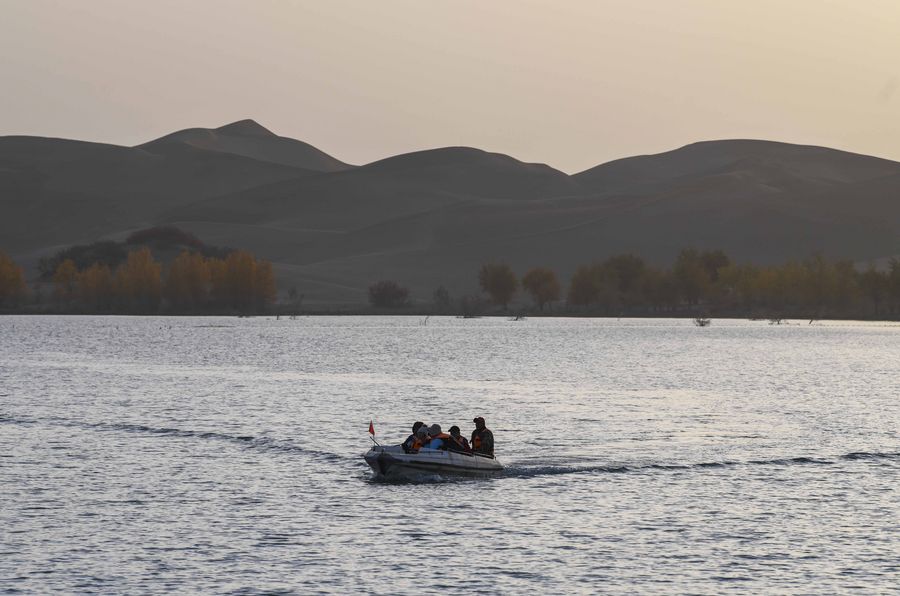 Tourists take a boat at Lop Nur in Yuli County, northwest China's Xinjiang Uygur Autonomous Region, Oct. 25, 2019. (Xinhua/Zhao Ge)