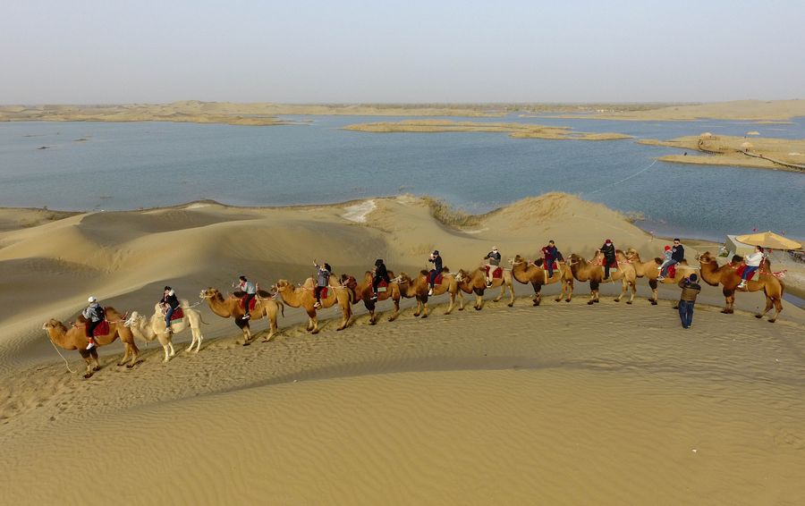 Aerial photo taken on Oct. 26, 2019 shows tourists riding camels to enjoy the desert scenery at Lop Nur People Village in Yuli County, northwest China's Xinjiang Uygur Autonomous Region. (Xinhua/Zhao Ge)