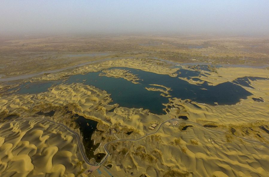 Aerial photo taken on Oct. 26, 2019 shows the scenery of Shennyu Lake scenic spot at Lop Nur People Village in Yuli County, northwest China's Xinjiang Uygur Autonomous Region. (Xinhua/Zhao Ge)