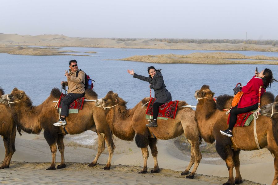 Tourists riding camels take photos beside the Shennyu Lake at Lop Nur People Village in Yuli County, northwest China's Xinjiang Uygur Autonomous Region, Oct. 26, 2019. (Xinhua/Zhao Ge)