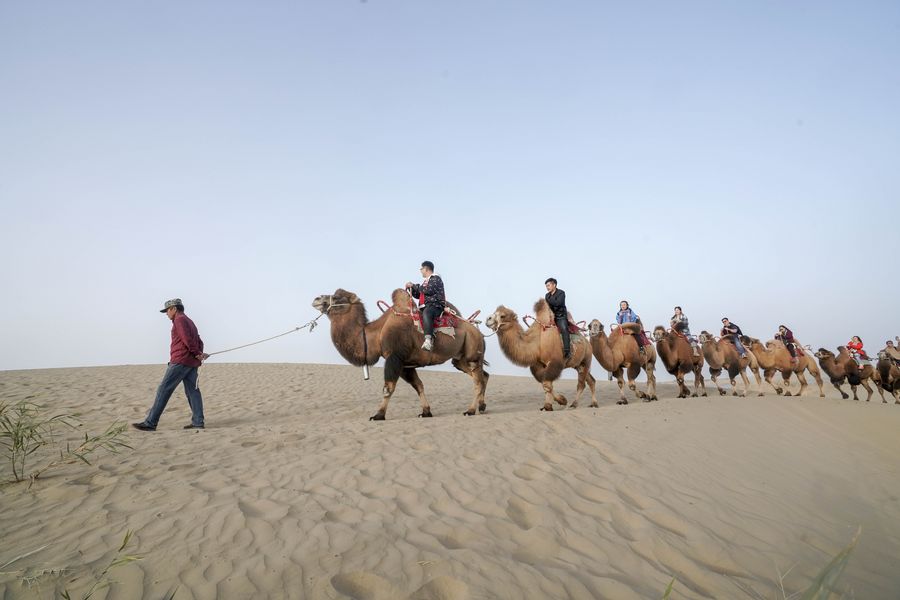 Tourists ride camels to enjoy the desert scenery at Lop Nur People Village in Yuli County, northwest China's Xinjiang Uygur Autonomous Region, Oct. 26, 2019. (Xinhua/Zhao Ge)
