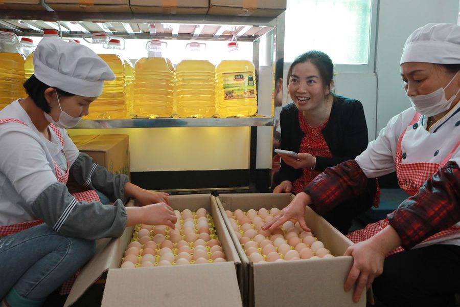 Staff members check information of received ingredients through a big data-based system at No.11 Primary School of Tongren City in southwest China's Guizhou Province, May 21, 2019. (Xinhua/Ou Dongqu)