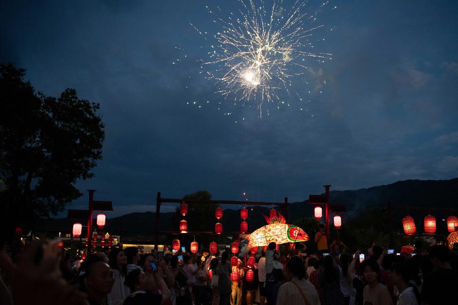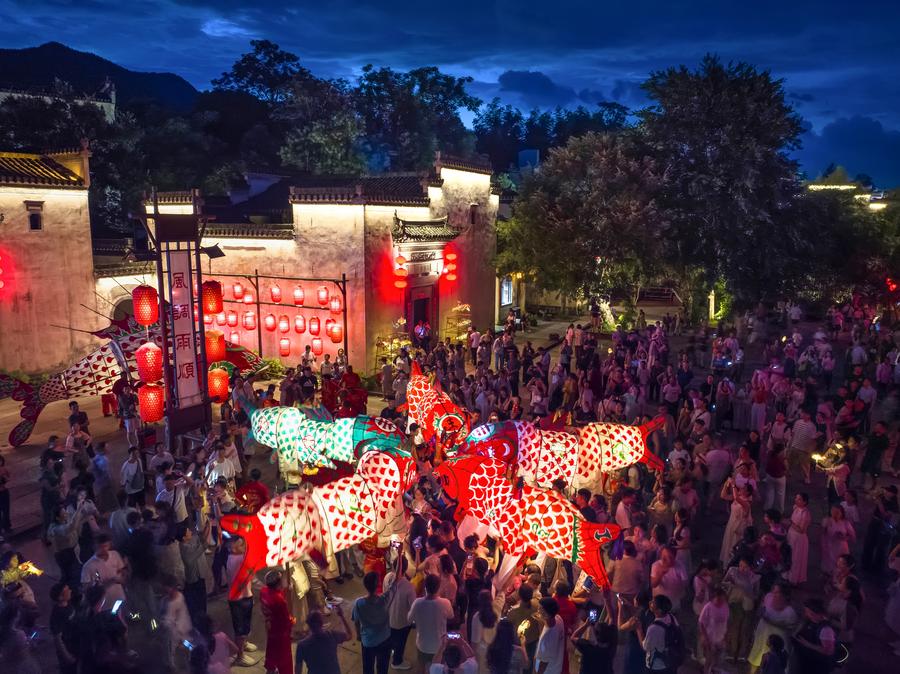 Tourists watch a fish lantern parade in Chengkan Village, Huizhou District of Huangshan City, east China's Anhui Province, July 25, 2025. (Xinhua/Zhang Duan)