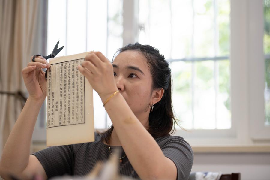 Book restorer Geng Ning cuts pages of ancient books at Anhui Provincial Library in Hefei, east China's Anhui Province, June 4, 2025. (Xinhua/Zhang Duan)