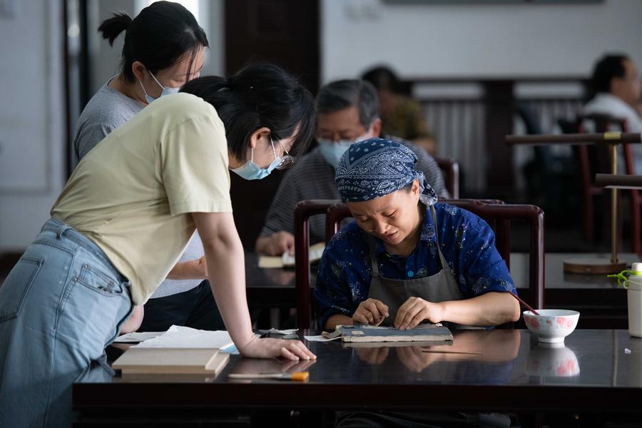 Book restorer Zhou Yahan (front, R) demonstrates restoration techniques at Anhui Provincial Library in Hefei, east China's Anhui Province, June 4, 2025.(Xinhua/Zhang Duan)