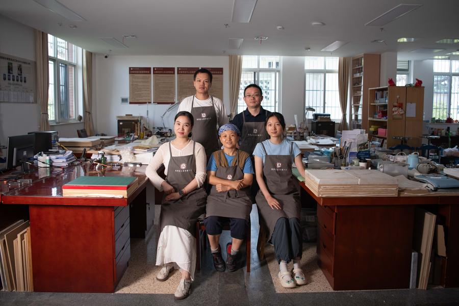 Book restorers Geng Ning, Zhou Yahan, Zhang Wenwen (front, from L to R), Jin Xin and Zang Chunhua (rear, from L to R) pose for a group photo at Anhui Provincial Library in Hefei, east China's Anhui Province, June 17, 2025. (Xinhua/Zhang Duan)■