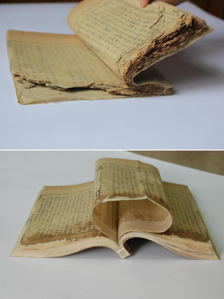 This undated combo photo shows an ancient book before restoration (above) and after restoration (below) at Anhui Provincial Library in Hefei, east China's Anhui Province. (Anhui Provincial Library/Handout via Xinhua)