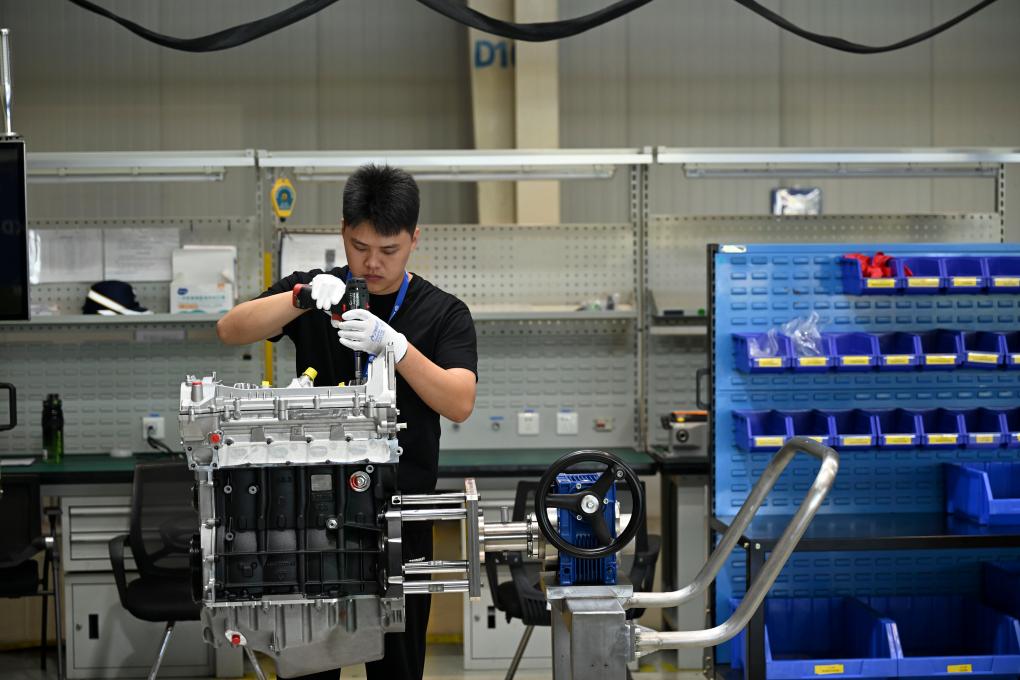 A staff member assembles an aeroengine at the Wuhu Diamond Aeroengine Co., Ltd. in Wanzhi Town of Wuhu City, east China's Anhui Province, Aug. 21, 2025. (Xinhua/Huang Bohan)