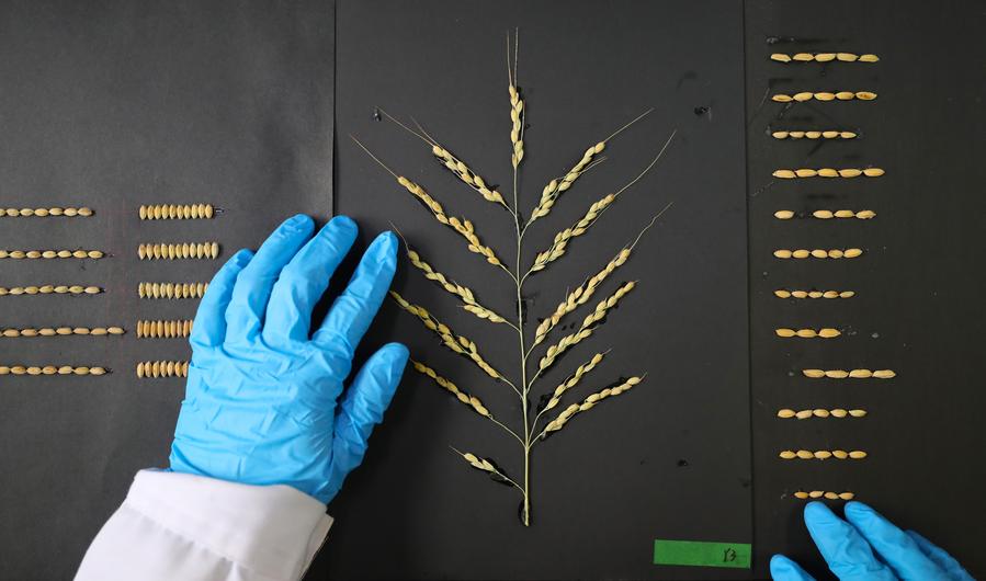 A technician observes the traits of rice seeds at a laboratory of Shenyang Agricultural University in northeast China's Liaoning Province, April 28, 2024. (Xinhua/Yang Qing)