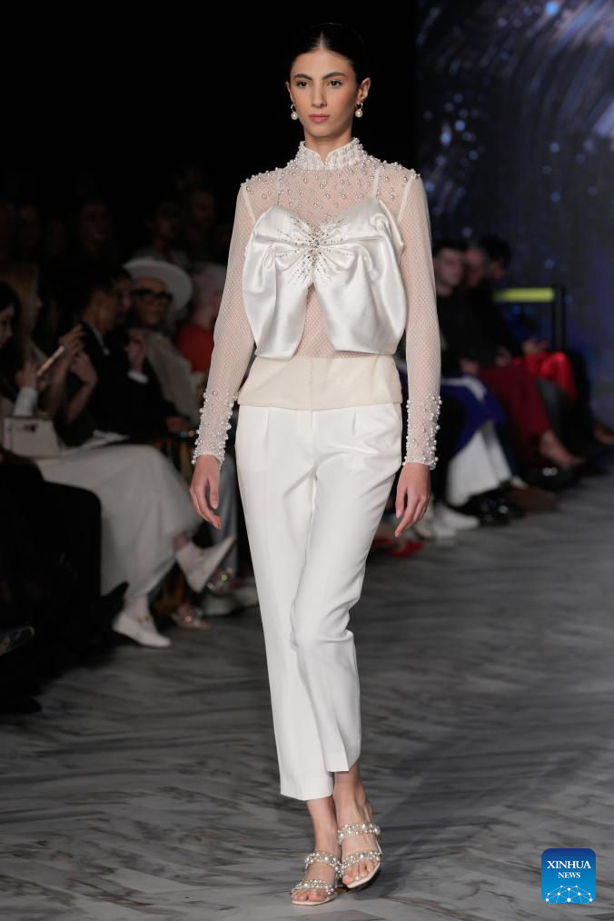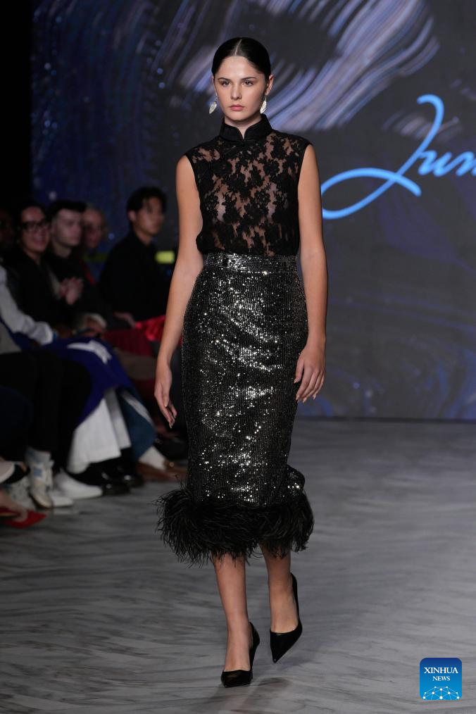A model walks the runway in JUMPER ZHANG's Spring/Summer 2026 collection during Vancouver Fashion Week in Vancouver, British Columbia, Canada, Oct. 16, 2025. (Photo by Liang Sen/Xinhua)