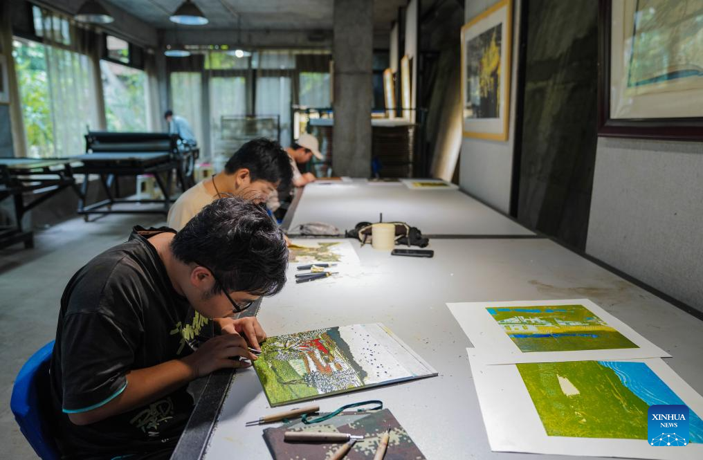 Students create woodblock printing works at a teaching and practicing base of Jueban woodblock printing in Pu'er University, Pu'er City, southwest China's Yunnan Province, Oct. 22, 2025. Jueban woodblock printing technique originated from Pu'er City in the 1980s. Unlike traditional multi-color woodcuts, this technique uses a single wooden block to achieve multi-color printing. It builds up the image through a process of repeated cutting and printing on a single block, printing with a different color after each cutting layer by layer. Once the final color is printed, the block is destroyed and cannot be reused.