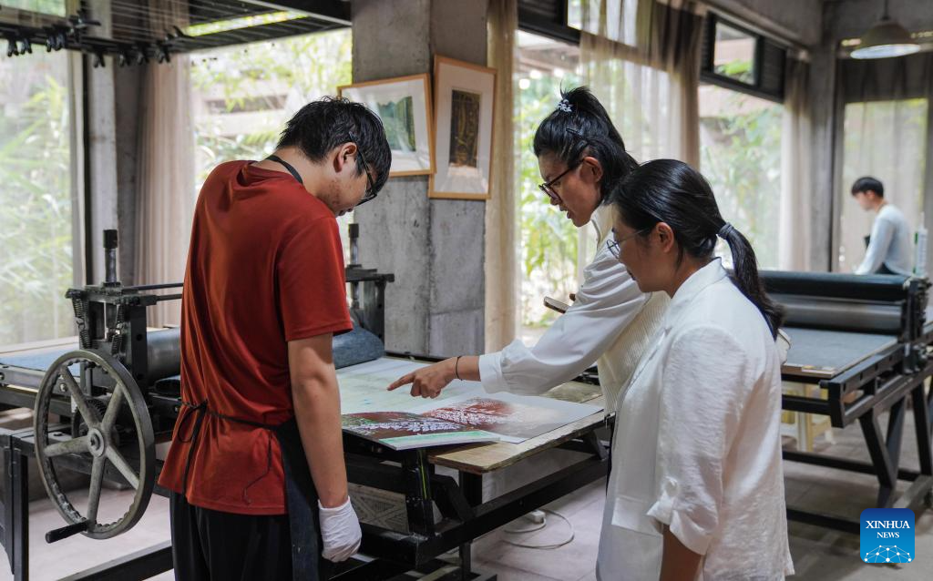 Students exchange woodblock printing techniques with a teacher at a teaching and practicing base of Jueban woodblock printing in Pu'er University, Pu'er City, southwest China's Yunnan Province, Oct. 22, 2025. Jueban woodblock printing technique originated from Pu'er City in the 1980s. Unlike traditional multi-color woodcuts, this technique uses a single wooden block to achieve multi-color printing. It builds up the image through a process of repeated cutting and printing on a single block, printing with a different color after each cutting layer by layer. Once the final color is printed, the block is destroyed and cannot be reused.