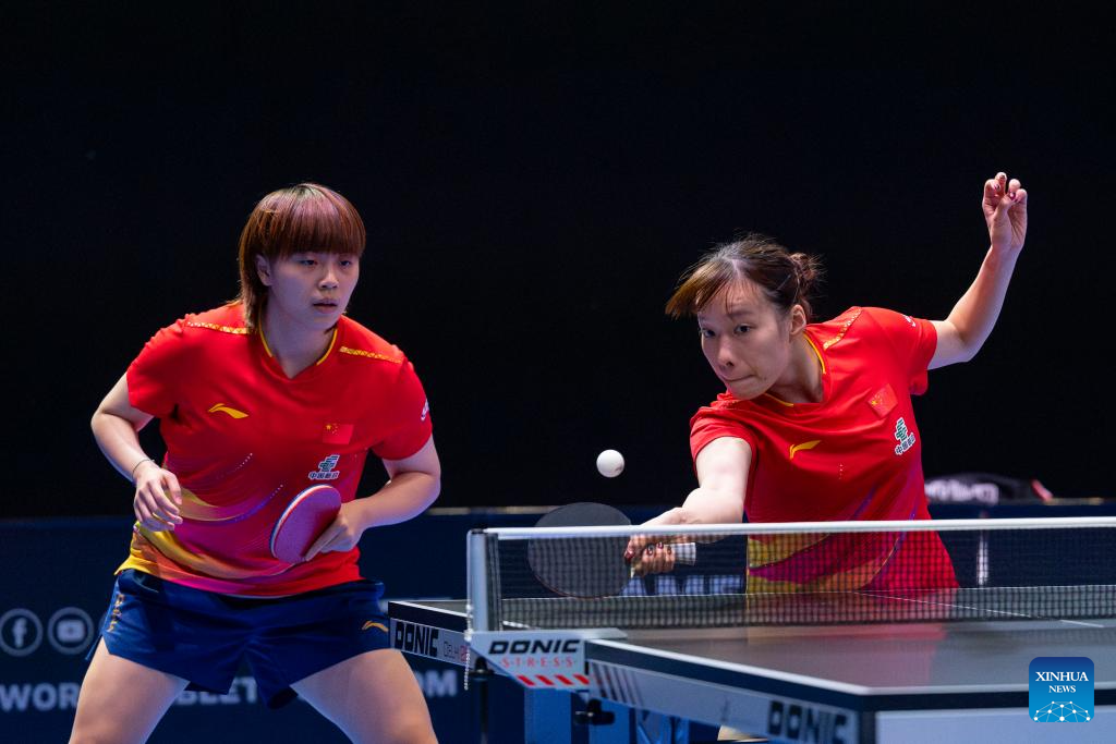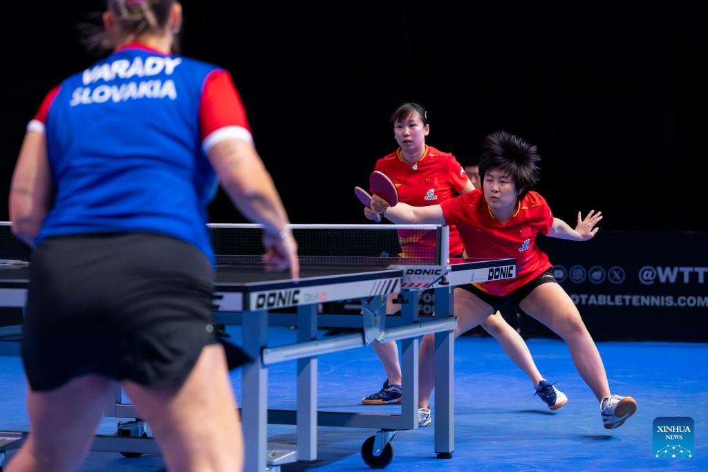 Qin Yuxuan (R)/Zong Geman of China compete during women's doubles quarterfinal against Barbora Varady/Tatiana Kukulkova of Slovakia in the WTT Star Contender London 2025 in London, Britain, on Oct. 24, 2025. (Photo by Stephen Chung/Xinhua)