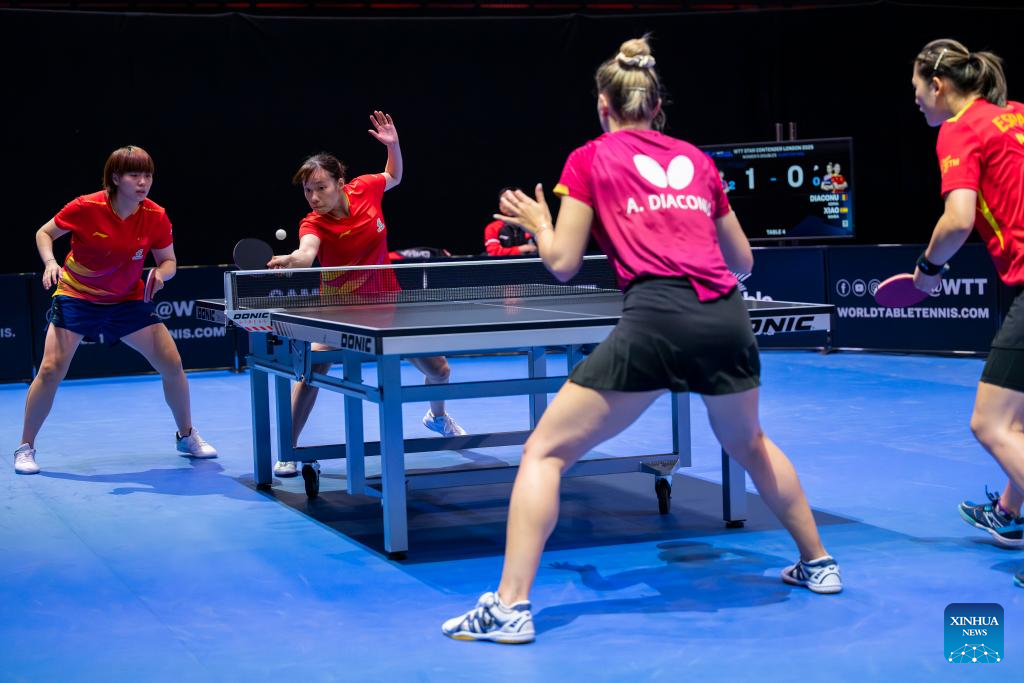 Shi Xunyao/Zhang Xiangyu (L) compete during women's doubles quarterfinal between Shi Xunyao/Zhang Xiangyu of China and Adina Diaconu (Romania)/Maria Xiao (Spain) in the WTT Star Contender London 2025 in London, Britain, on Oct. 24, 2025. (Photo by Stephen Chung/Xinhua)