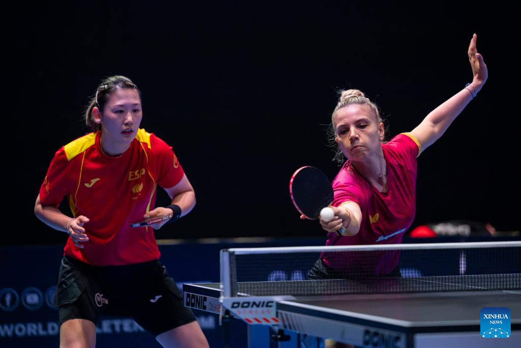 Adina Diaconu (R)/Maria Xiao compete during women's doubles quarterfinal between Shi Xunyao/Zhang Xiangyu of China and Adina Diaconu (Romania)/Maria Xiao (Spain) in the WTT Star Contender London 2025 in London, Britain, on Oct. 24, 2025. (Photo by Stephen Chung/Xinhua)