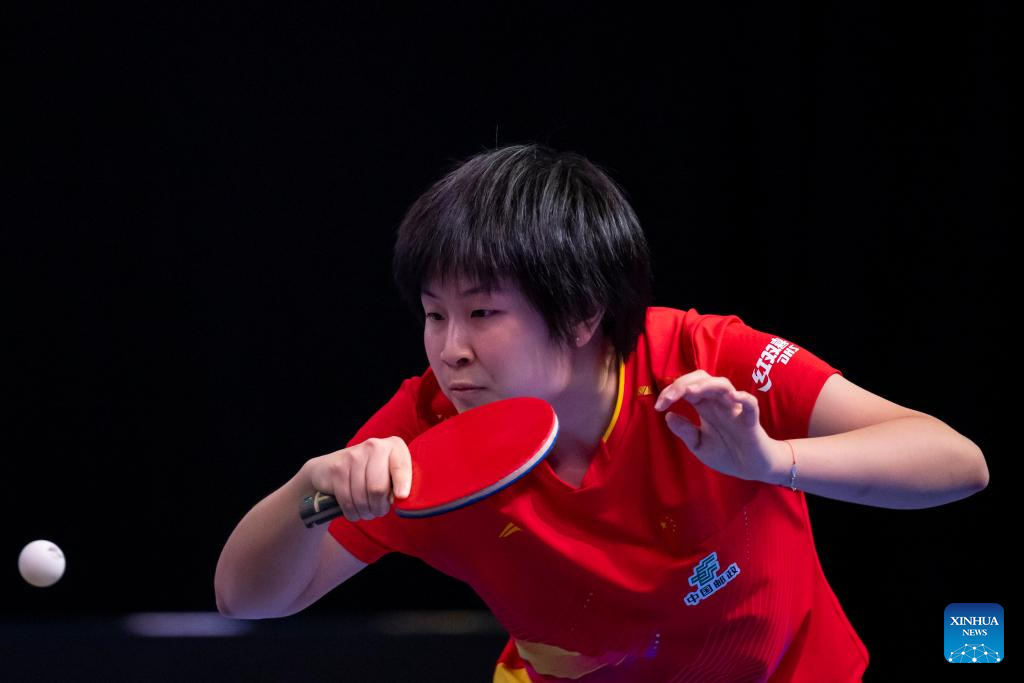 Shi Xunyao returns a shot during the women's singles round of 32 match between Shi Xunyao of China and Charlotte Lutz of France in the WTT Star Contender London 2025 in London, Britain, on Oct. 24, 2025. (Photo by Stephen Chung/Xinhua)