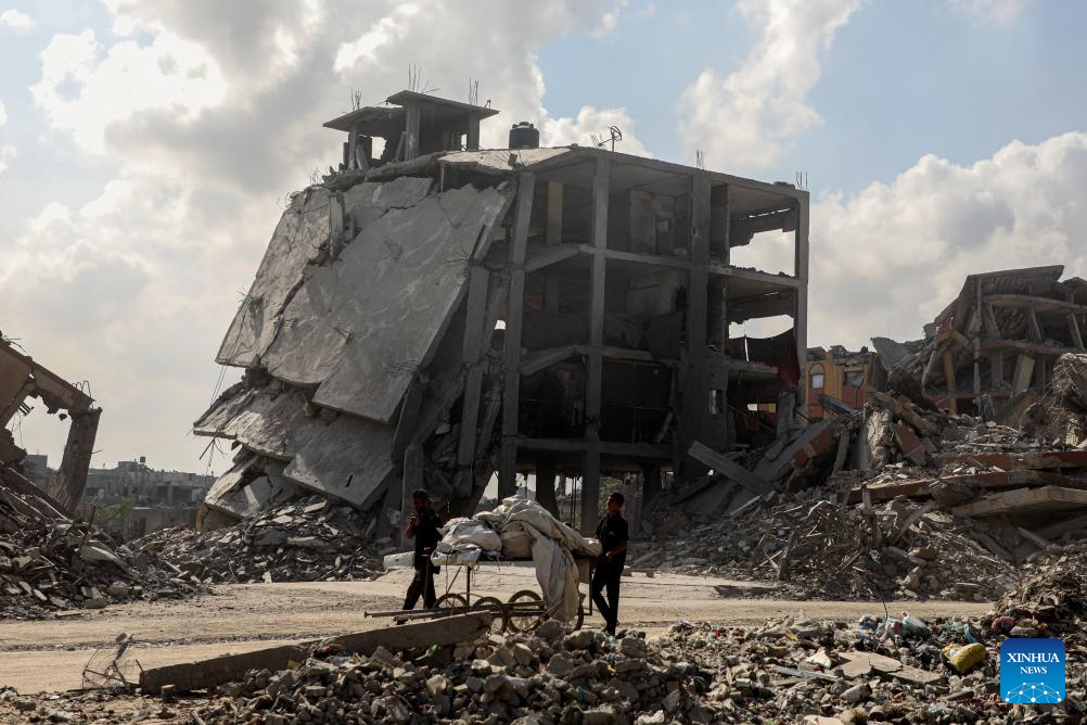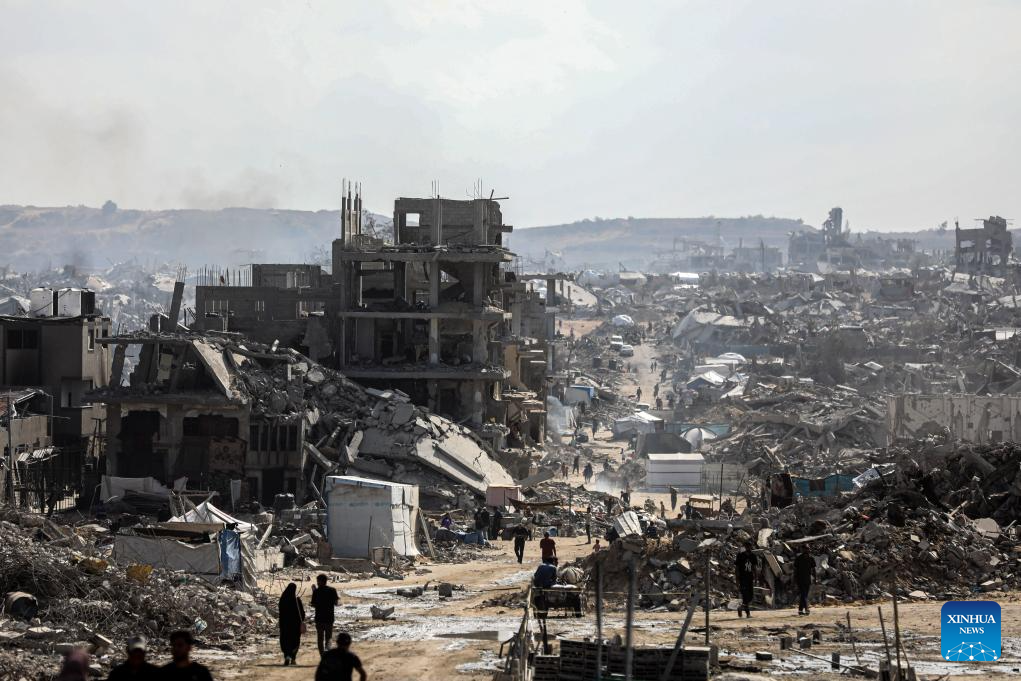 Palestinians walk past destroyed buildings in Jabalia, northern Gaza Strip, Oct. 24, 2025. The United Nations estimates that approximately 92 percent of all residential buildings in Gaza -- around 436,000 homes -- have been damaged or destroyed since the start of the conflict. According to the UN, at least 1.9 million people across the Gaza Strip have been displaced during the war. (Photo by Rizek Abdeljawad/Xinhua)