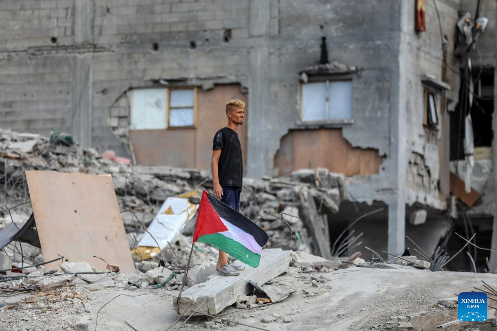 A Palestinian is seen standing next to destroyed buildings, in Jabalia, northern Gaza Strip, Oct. 24, 2025. The United Nations estimates that approximately 92 percent of all residential buildings in Gaza -- around 436,000 homes -- have been damaged or destroyed since the start of the conflict. According to the UN, at least 1.9 million people across the Gaza Strip have been displaced during the war. (Photo by Rizek Abdeljawad/Xinhua)