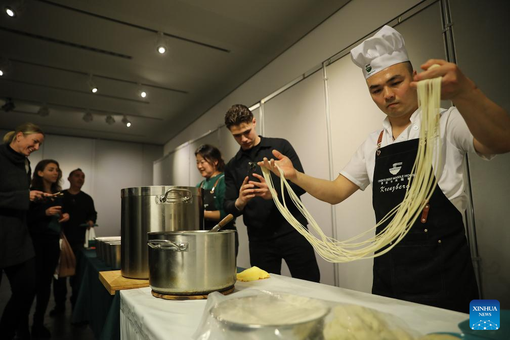 Photo taken on Nov. 11, 2025, shows a live demonstration of Lanzhou beef noodle making at the Chinese Cultural Center in Berlin, Germany.(Xinhua/Du Zheyu)