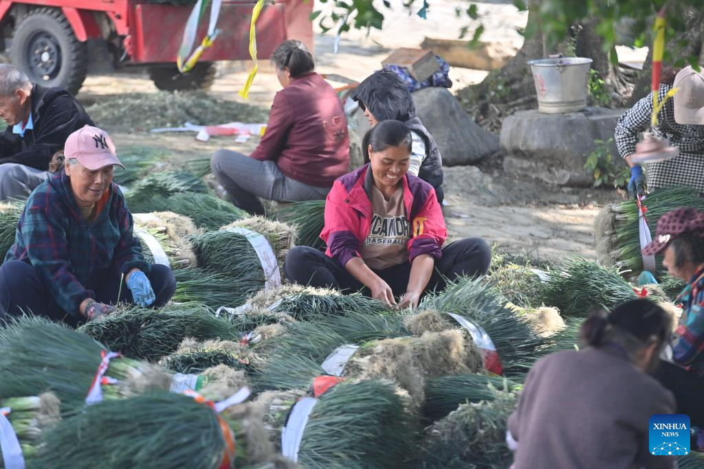 Villagers clean harvested chives in Jueshan Village of Sandu Town in Liuzhou City, south China's Guangxi Zhuang Autonomous Region, Oct. 28, 2025. Sandu Town has in recent years promoted the standardized and industrialized production of chives, and developed an integrated business system that ranges from planting and processing to sales and service.