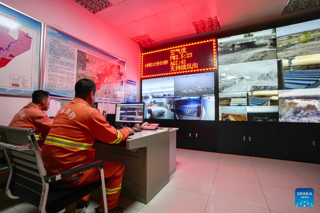 Staff members operate with an intelligent monitoring platform at the Tianhewan National Wetland Park in Pingluo County of Shizuishan, northwest China's Ningxia Hui Autonomous Region, Nov. 11, 2025.