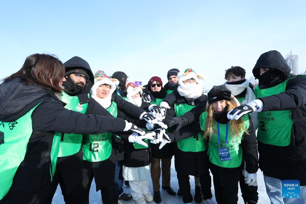 Students from Cambridge compete during the "HIT-Cambridge-Oxford Cup" Ice Dragon Boat International Friendship Race in Harbin, northeast China's Heilongjiang Province, Jan. 10, 2026. (Xinhua)