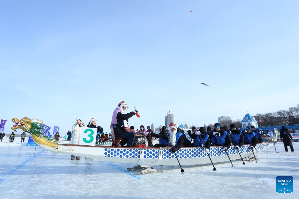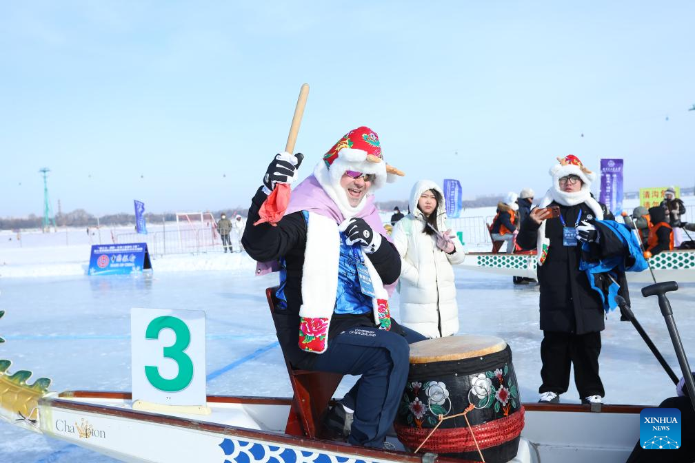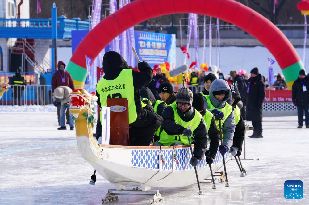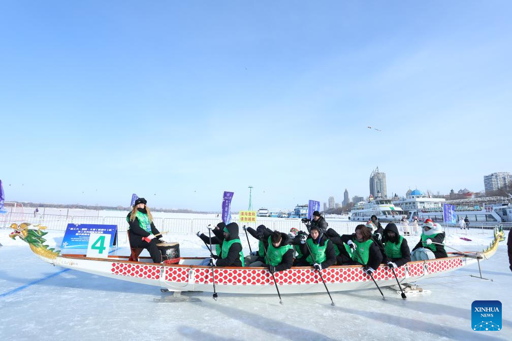 HARBIN, Jan. 10 (Xinhua) -- Cheers pierced the frigid air over the frozen Songhua River in northeast China's Heilongjiang Province on Saturday, as students from elite Chinese and British universities competed in a first-of-its-kind ice dragon boat race.
