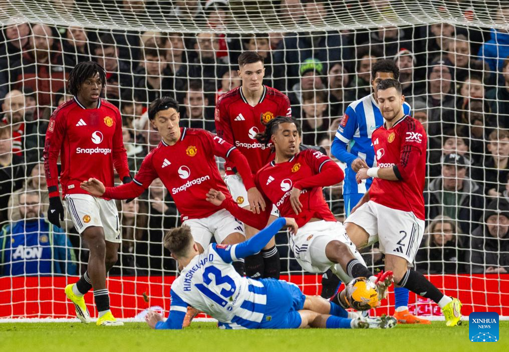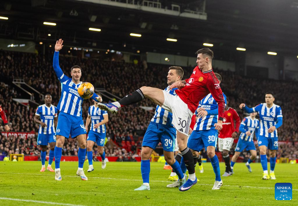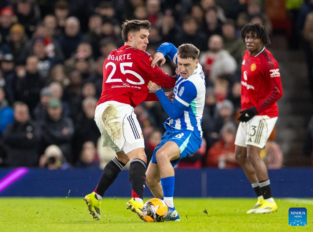 Manchester United's Manuel Ugarte (L) vies with Brighton & Hove Albion's Brajan Gruda (C) during the FA Cup 3rd Round match between Manchester United FC and Brighton & Hove Albion FC in Manchester, Britain, on Jan. 11, 2026. (Xinhua)