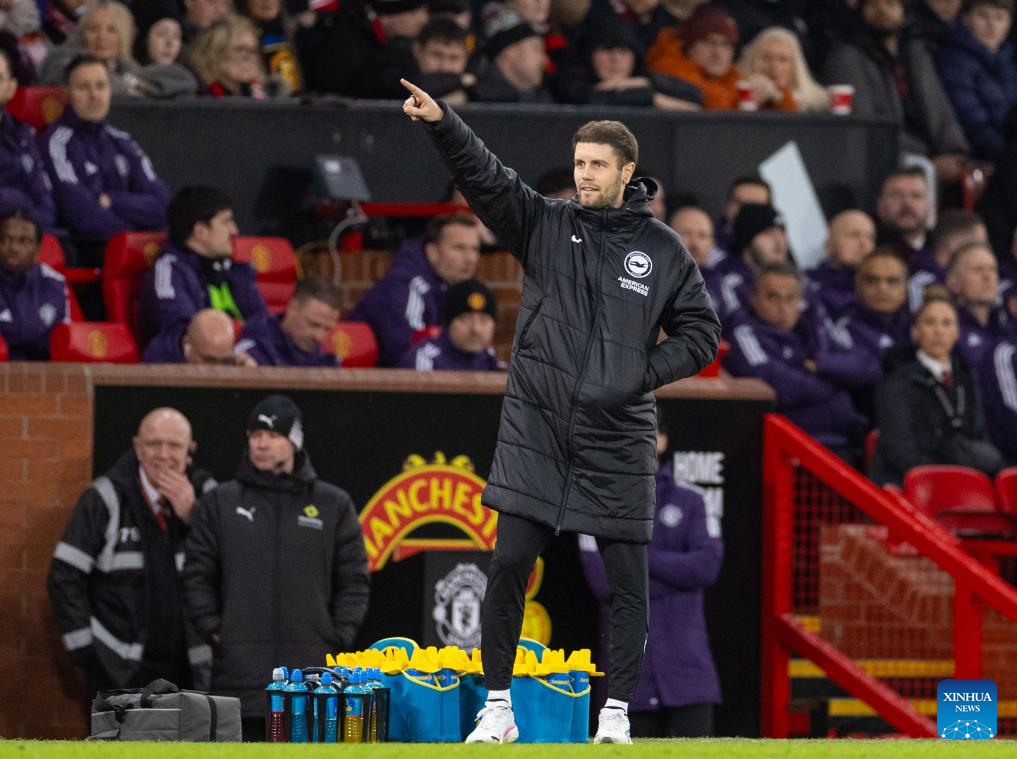 Brighton & Hove Albion's manger Fabian Hurzeler gestures during the FA Cup 3rd Round match between Manchester United FC and Brighton & Hove Albion FC in Manchester, Britain, on Jan. 11, 2026. (Xinhua)