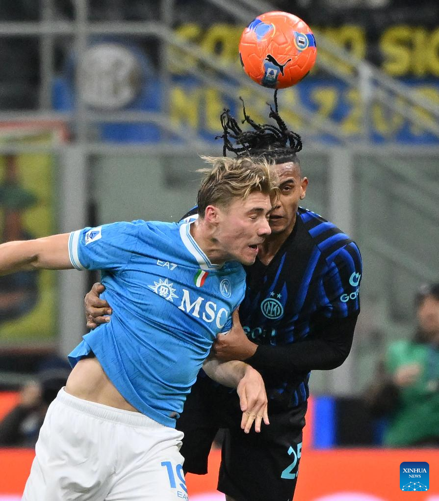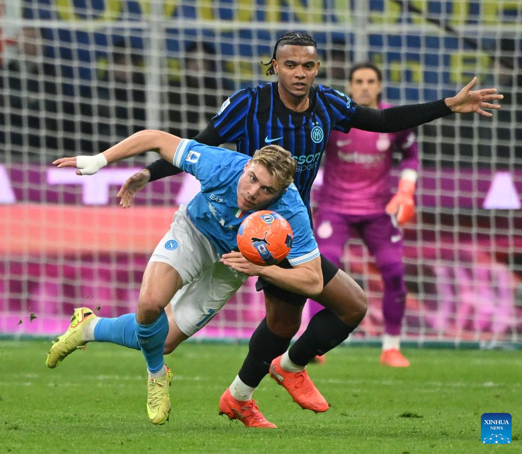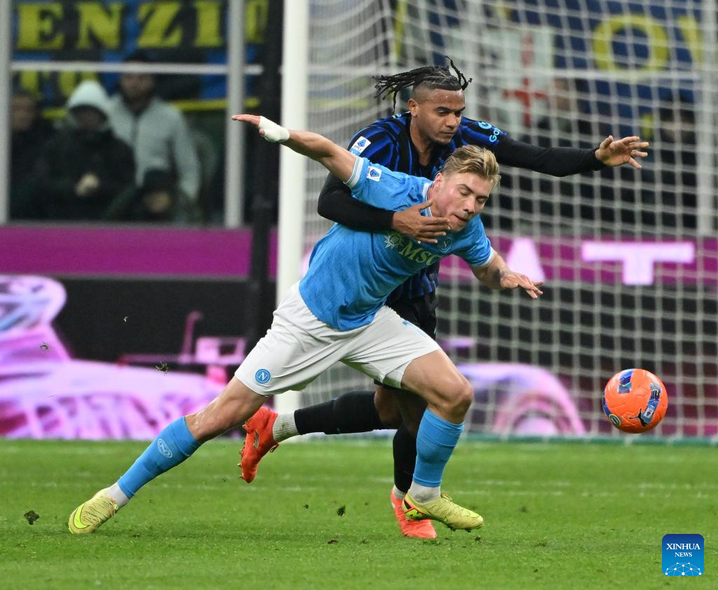 Inter Milan's Manuel Akanji (R) vies with Napoli's Rasmus Hojlund during a Serie A football match between Inter Milan and Napoli in Milan, Italy, Jan. 11, 2026. (Photo by Alberto Lingria/Xinhua)