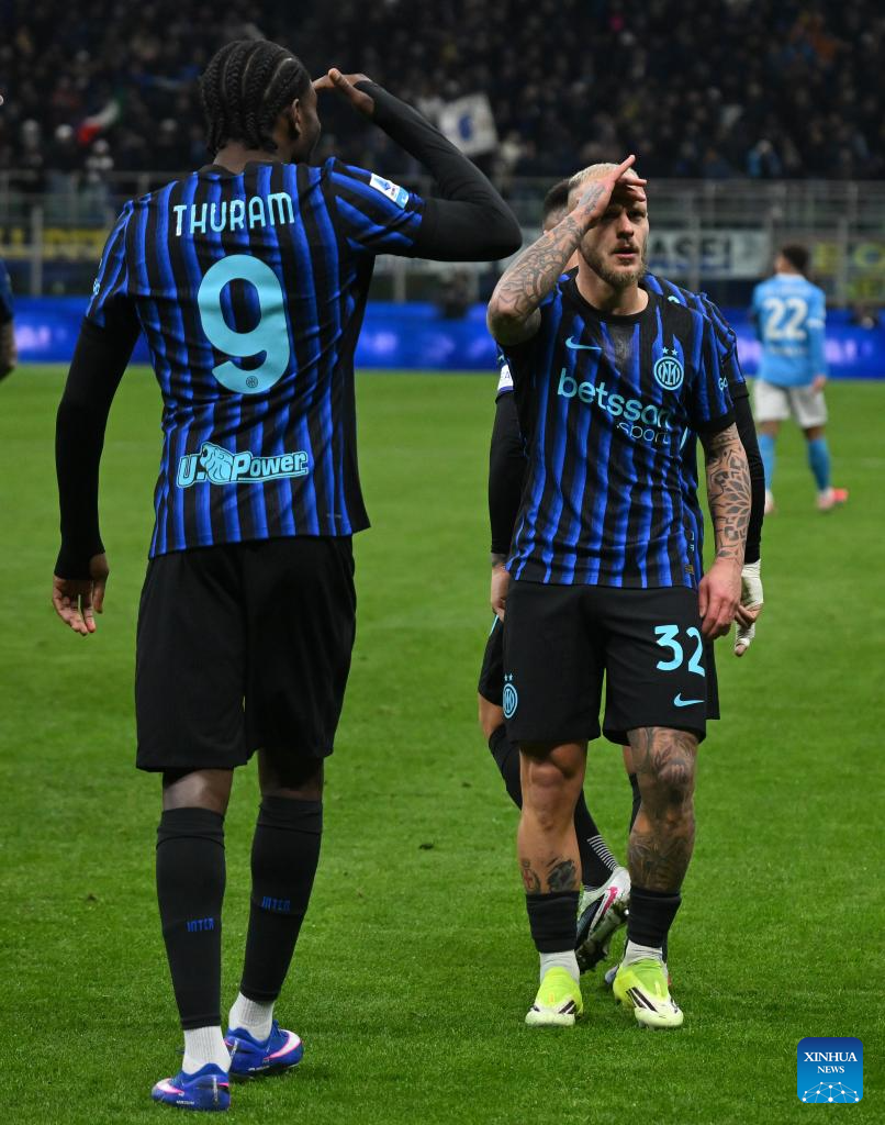 Inter Milan's Federico Dimarco (R) celebrates his goal during a Serie A football match between Inter Milan and Napoli in Milan, Italy, Jan. 11, 2026. (Photo by Alberto Lingria/Xinhua)