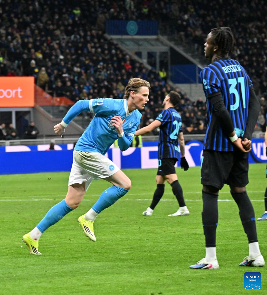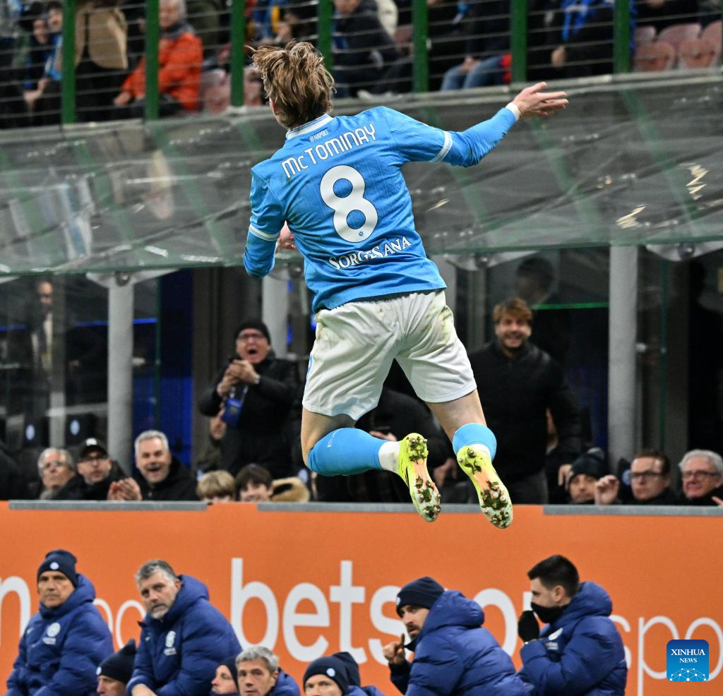 Napoli's Scott McTominay (L) celebrates his goal during a Serie A football match between Inter Milan and Napoli in Milan, Italy, Jan. 11, 2026. (Photo by Alberto Lingria/Xinhua)