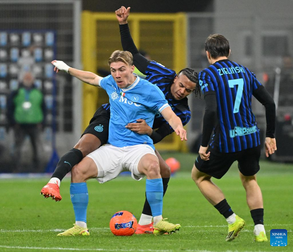 Inter Milan's Manuel Akanji (rear) and Piotr Zielinski (R) vies with Napoli's Rasmus Hojlund during a Serie A football match between Inter Milan and Napoli in Milan, Italy, Jan. 11, 2026. (Photo by Alberto Lingria/Xinhua)