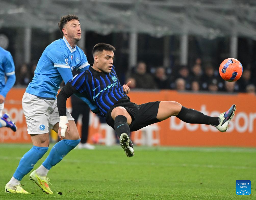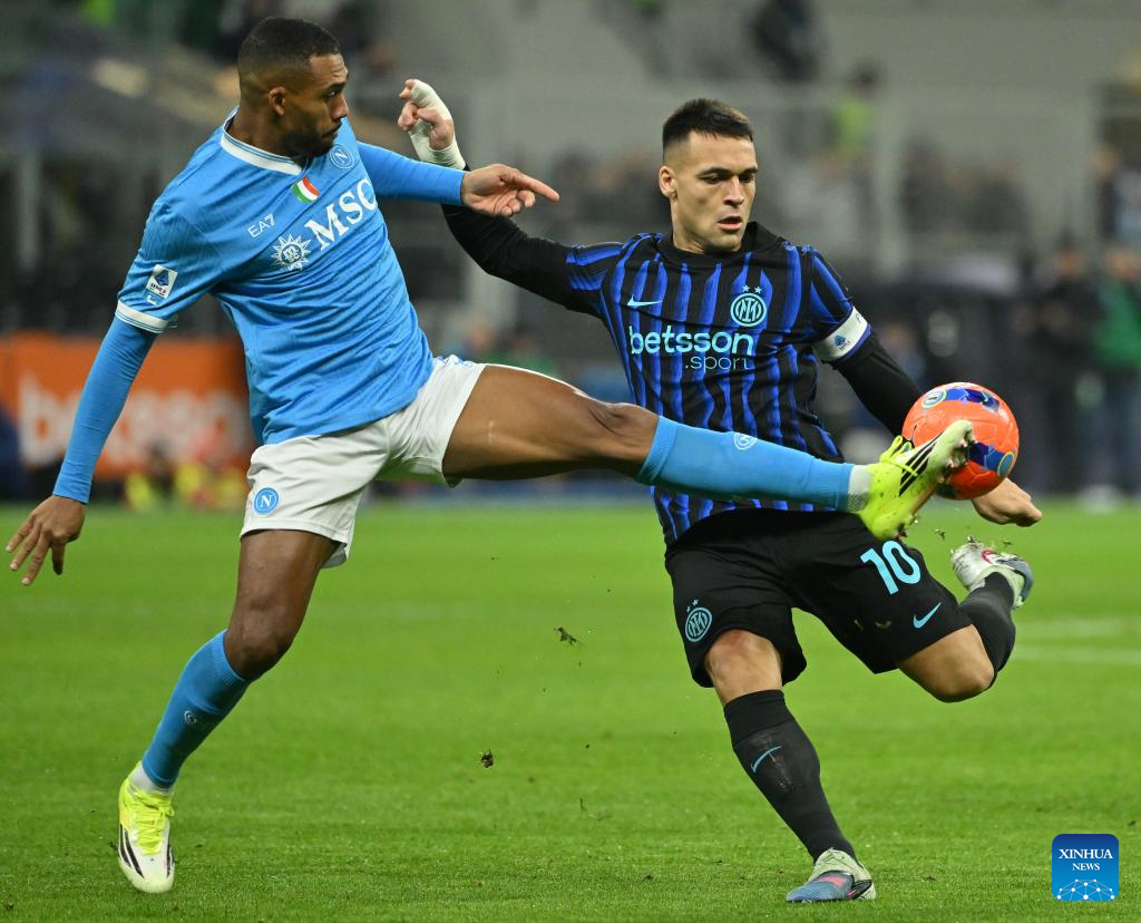 Inter Milan's Lautaro Martinez (R) vies with Napoli's Amir Rrahmani during a Serie A football match between Inter Milan and Napoli in Milan, Italy, Jan. 11, 2026. (Photo by Alberto Lingria/Xinhua)