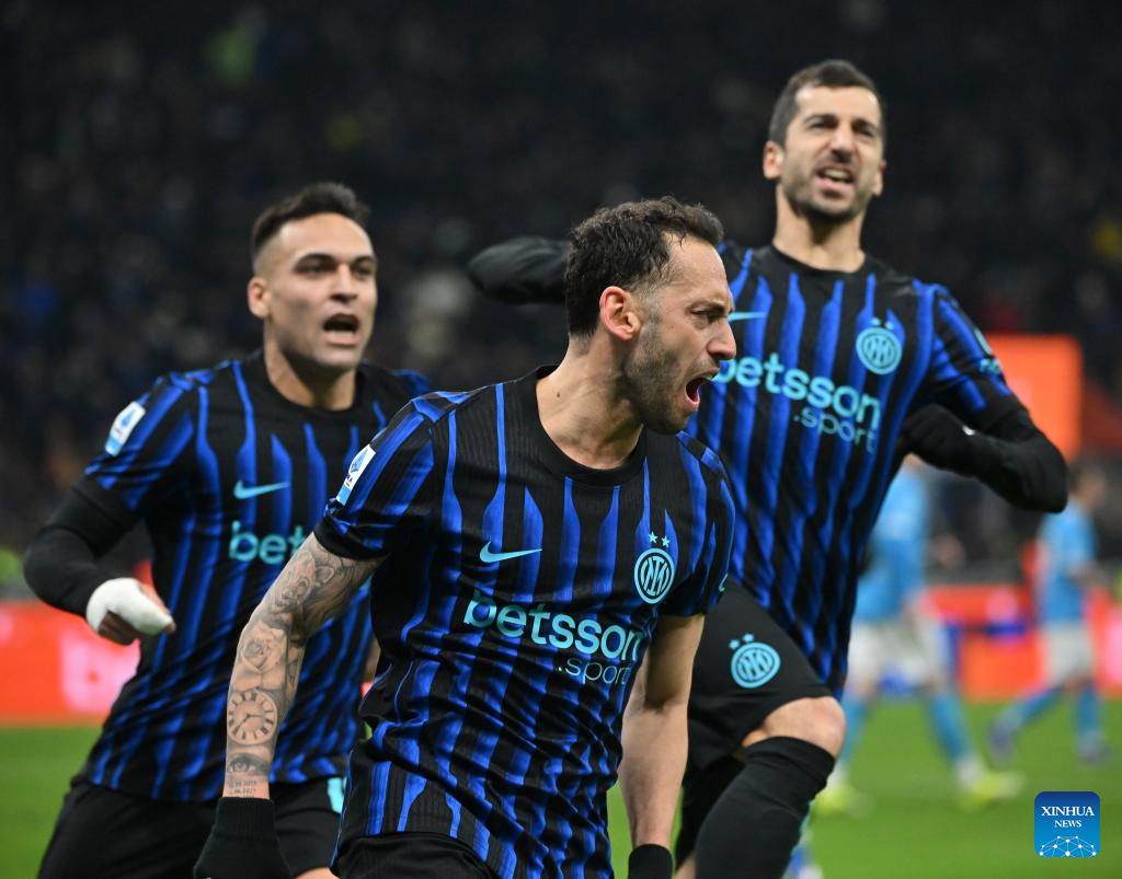 Inter Milan's Hakan Calhanoglu (C) celebrates his goal during a Serie A football match between Inter Milan and Napoli in Milan, Italy, Jan. 11, 2026. (Photo by Alberto Lingria/Xinhua)