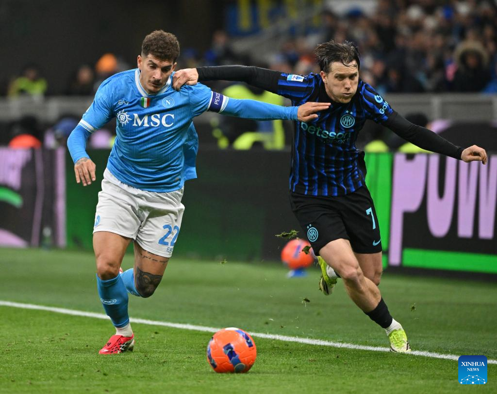 Inter Milan's Piotr Zielinski (R) vies with Napoli's Giovanni Di Lorenzo during a Serie A football match between Inter Milan and Napoli in Milan, Italy, Jan. 11, 2026. (Photo by Alberto Lingria/Xinhua)