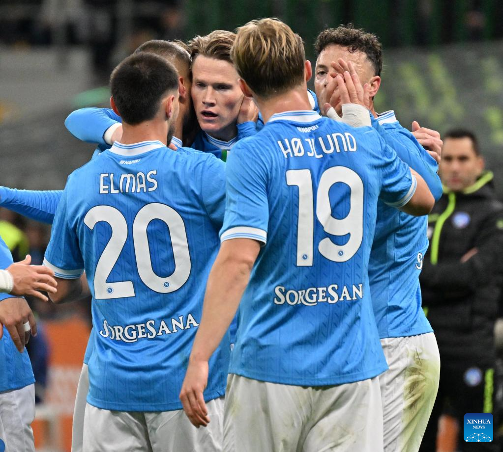 Napoli's Scott McTominay (C) celebrates his goal with his teammates during a Serie A football match between Inter Milan and Napoli in Milan, Italy, Jan. 11, 2026. (Photo by Alberto Lingria/Xinhua)