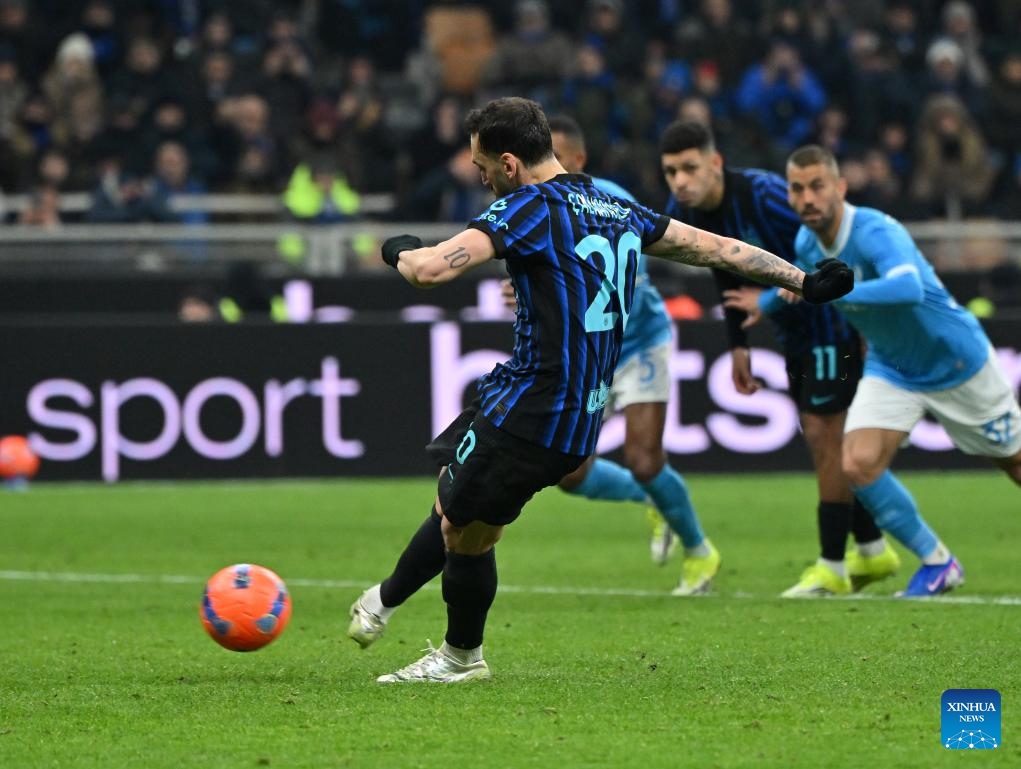 Inter Milan's Hakan Calhanoglu scores penalty goal during a Serie A football match between Inter Milan and Napoli in Milan, Italy, Jan. 11, 2026. (Photo by Alberto Lingria/Xinhua)