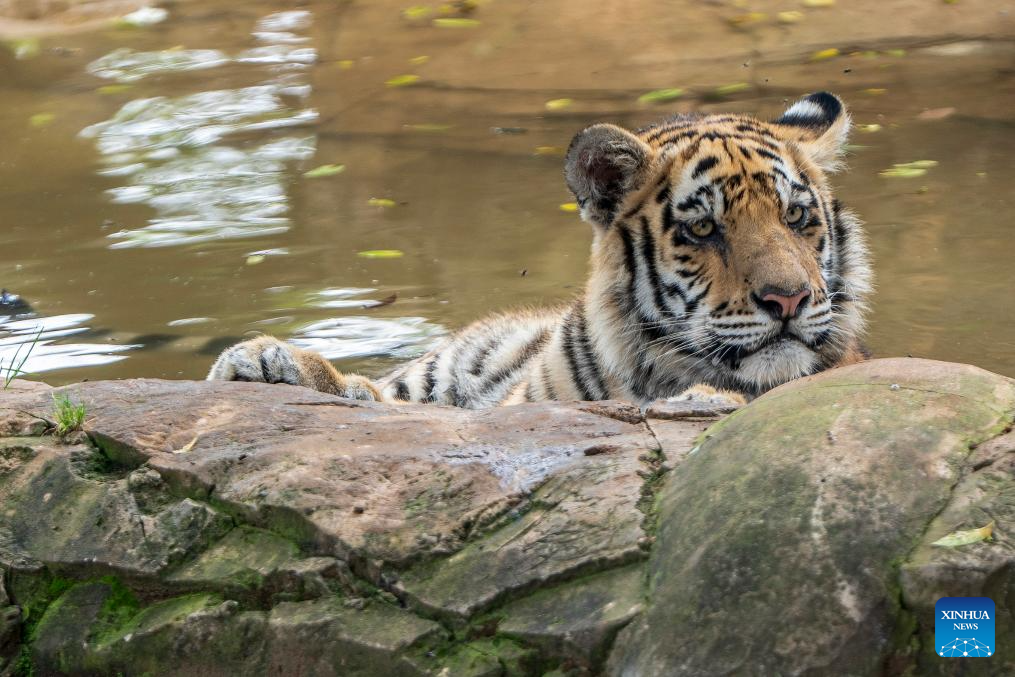 An eleven-month-old Bengal tiger cub is seen at the Johannesburg Zoo in Johannesburg, South Africa, on Jan. 9, 2026. Two Bengal tiger cubs were rescued from illegal trade. They made their public debut on Jan. 8. (Photo by Shiraaz Mohamed/Xinhua)