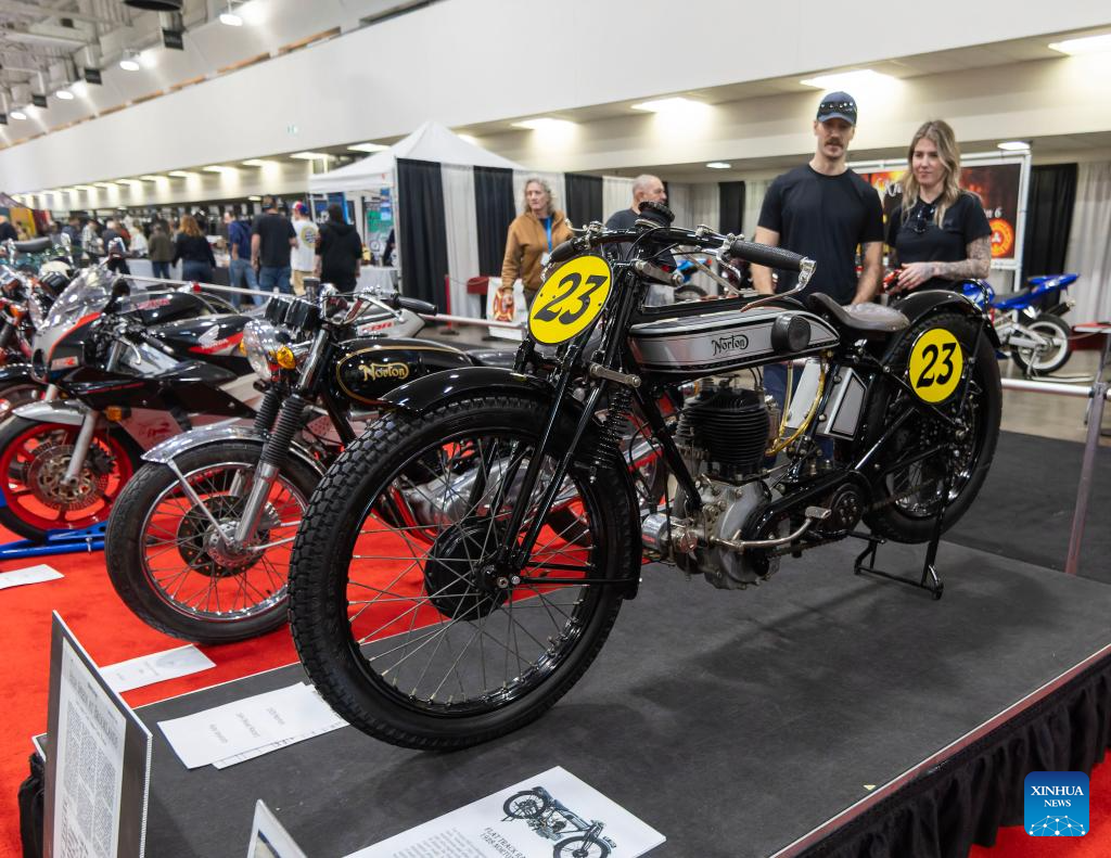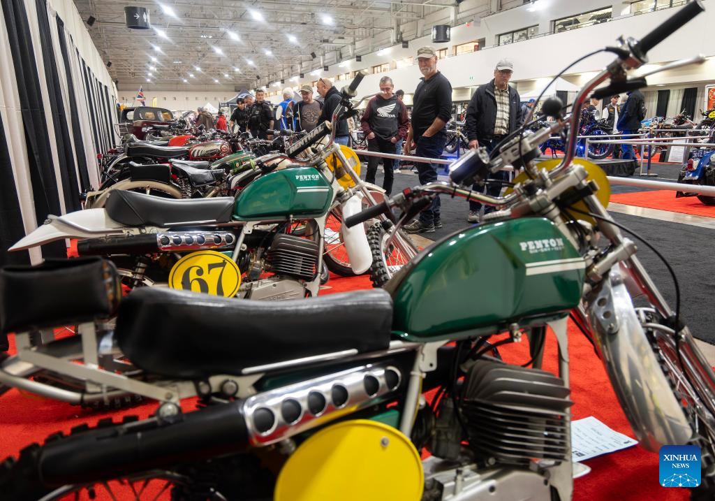 People look at vintage and classic motorcycles during the 50th Annual North American International Motorcycle Supershow in Mississauga, Ontario, Canada, on Jan. 9, 2026. Featuring more than 1,100 motorcycles from over 500 exhibitors, this annual three-day event kicked off here on Friday. (Photo by Zou Zheng/Xinhua)