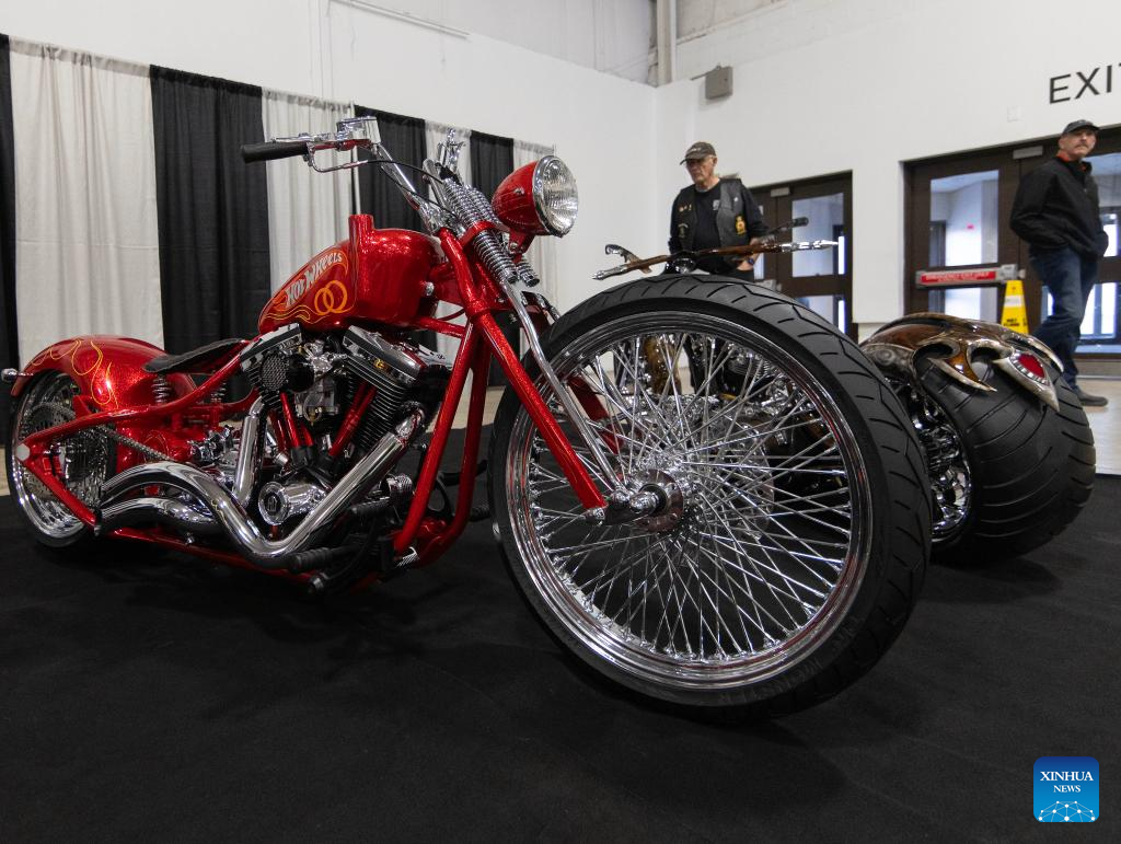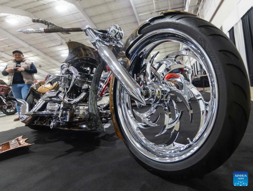 People look at a custom motorcycle during the 50th Annual North American International Motorcycle Supershow in Mississauga, Ontario, Canada, on Jan. 9, 2026. Featuring more than 1,100 motorcycles from over 500 exhibitors, this annual three-day event kicked off here on Friday. (Photo by Zou Zheng/Xinhua)