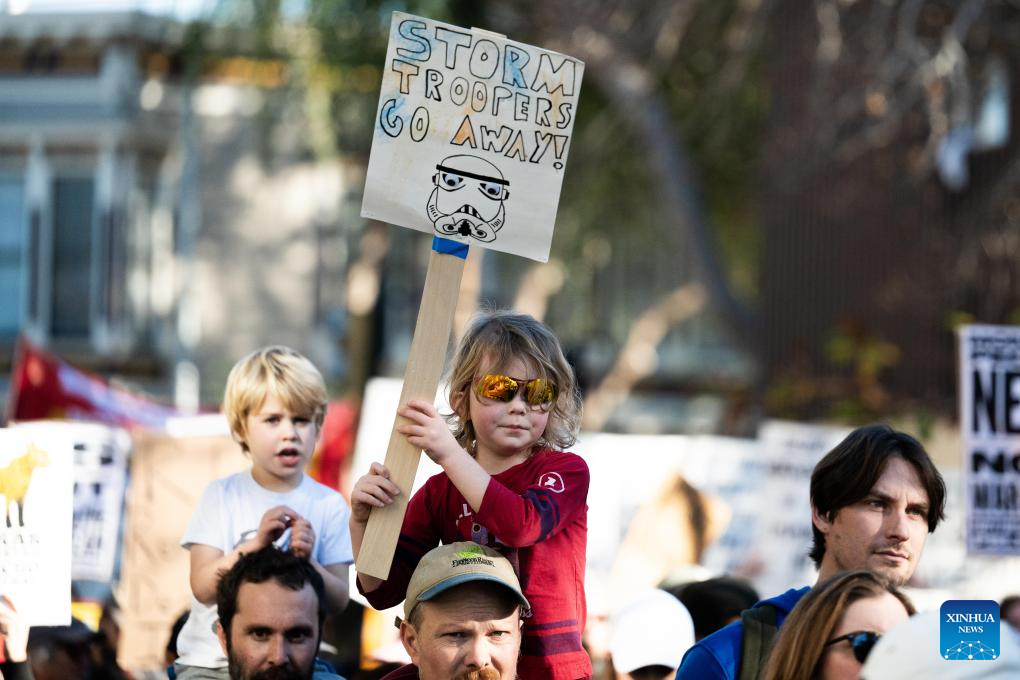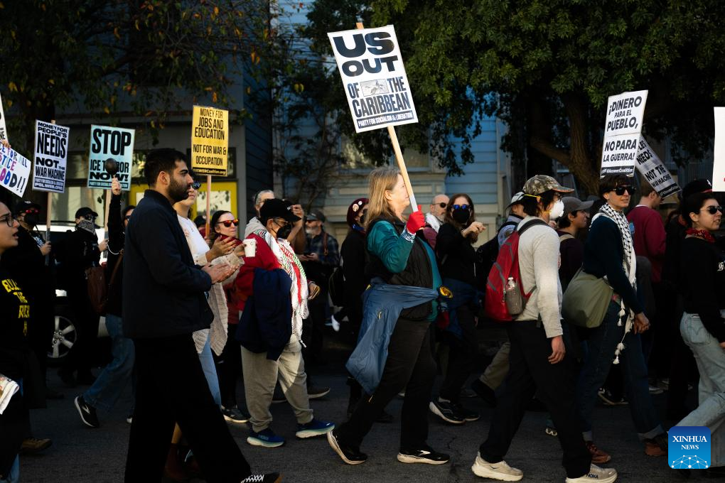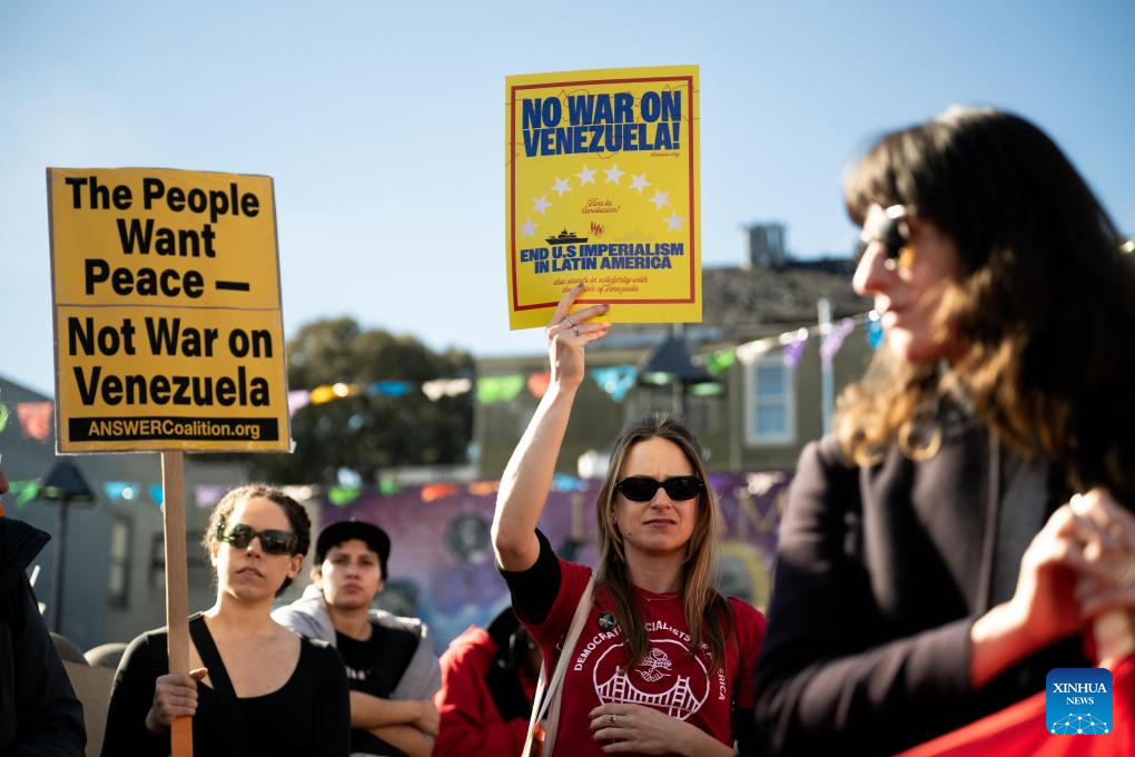 People attend a protest in San Francisco, California, the United States, on Jan. 10, 2026. People gathered here to protest against the U.S. attack on Venezuela, as well as a fatal shooting of a 37-year-old woman by an Immigration and Customs Enforcement agent in Minnesota on Jan. 7. (Photo by Ziyu Julian Zhu/Xinhua)