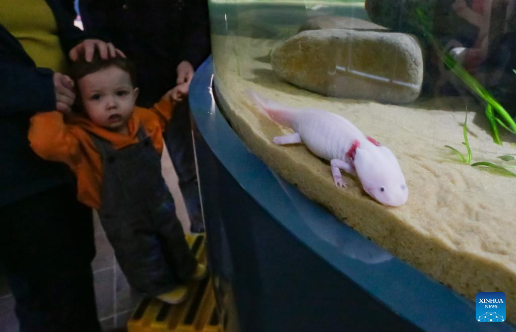 A girl observes an axolotl during the "Amazing Axolotls" exhibition at the Vancouver Aquarium in Vancouver, British Columbia, Canada, Jan. 11, 2026. The new permanent exhibit at the Vancouver Aquarium opened on Sunday features multiple habitats and interactive displays highlighting the unique biology and regenerative abilities of axolotls, an endangered amphibian native to Mexico. (Photo by Liang Sen/Xinhua)