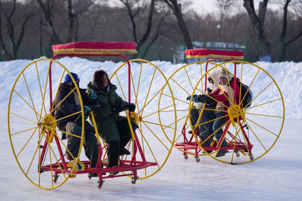 1月8日,外国游客在太阳岛雪博会园区体验冰上自行车。