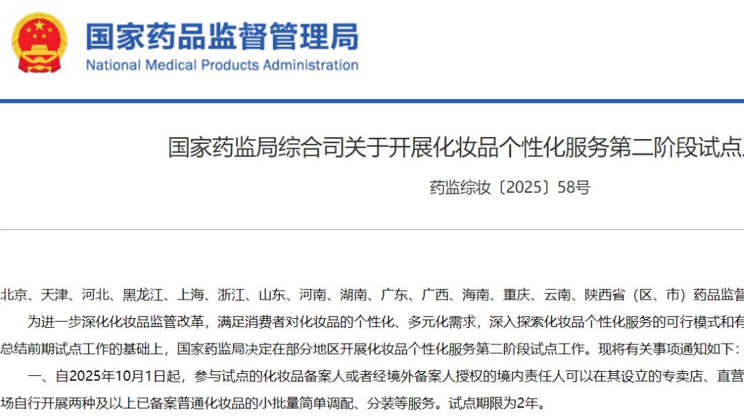 國(guó)家藥監(jiān)局綜合司關(guān)于開展化妝品個(gè)性化服務(wù)第二階段試點(diǎn)工作的通知 藥監(jiān)綜妝〔2025〕58號(hào)