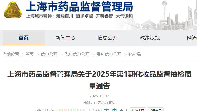 上海市藥品監(jiān)督管理局關(guān)于2025年第1期化妝品監(jiān)督抽檢質(zhì)量通告
