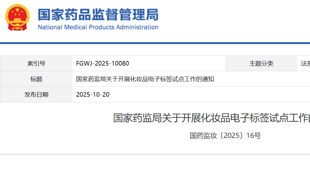 國(guó)家藥監(jiān)局關(guān)于開展化妝品電子標(biāo)簽試點(diǎn)工作的通知 國(guó)藥監(jiān)妝〔2025〕16號(hào)