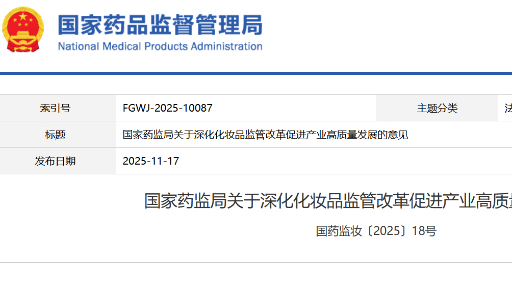 國(guó)家藥監(jiān)局關(guān)于深化化妝品監(jiān)管改革促進(jìn)產(chǎn)業(yè)高質(zhì)量發(fā)展的意見 國(guó)藥監(jiān)妝〔2025〕18號(hào)