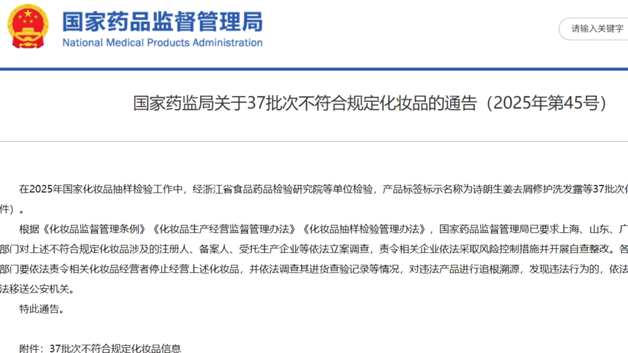 國(guó)家藥監(jiān)局關(guān)于37批次不符合規(guī)定化妝品的通告(2025年第45號(hào))